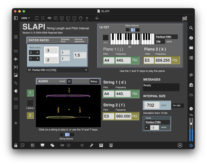 SLAPI (String Length and Pitch Interval) is a playground for hands-on experimentation with harmonic series intervals. It is a tool that allows the curiosity-driven learner to discover exactly how far "out of tune" equal-tempered intervals are with respect to nature. SLAPI makes it easy to easily explore the sonic signatures of just intervals on a plucked-string timbre and compare them with their equal-tempered counterparts on the modern piano. Enter whole-number ratio and SLAPI will report the ratio's simplest form, decimal expansion, size in cents, and deviation from 12-tet in cents. SLAPI will also visualize the ratio on a virtual monochord, reporting the associated pitch interval's component pitches and frequencies with respect to the standard pitch A4 = 440 Hz.